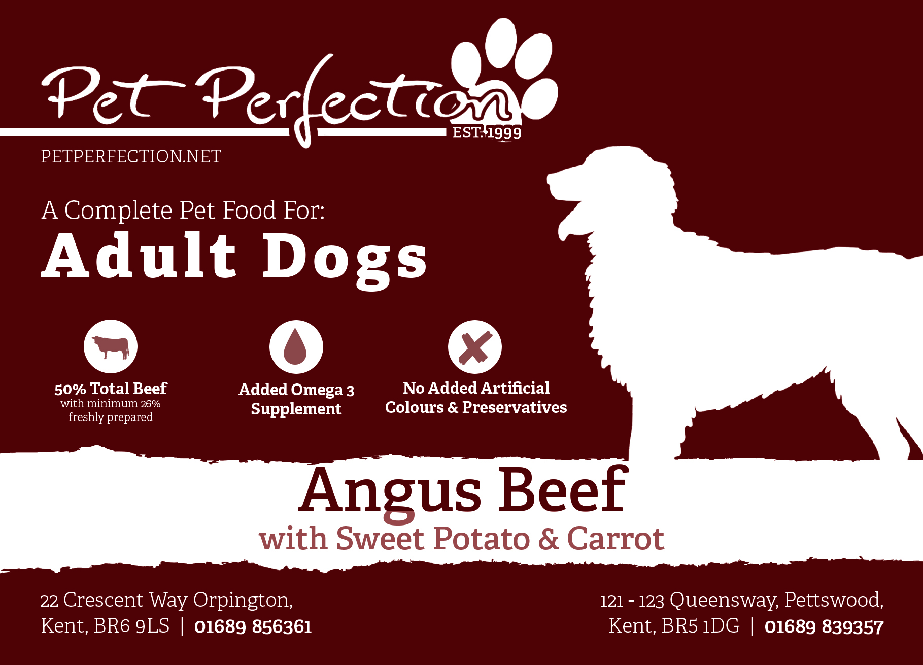 Beef 19% & Beef Fat 3%), Sweet Potato (26%), Potato, Peas (5%),