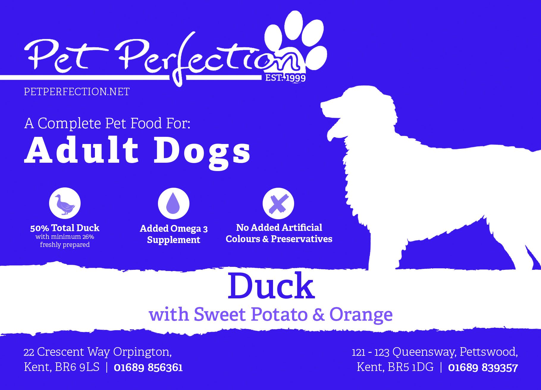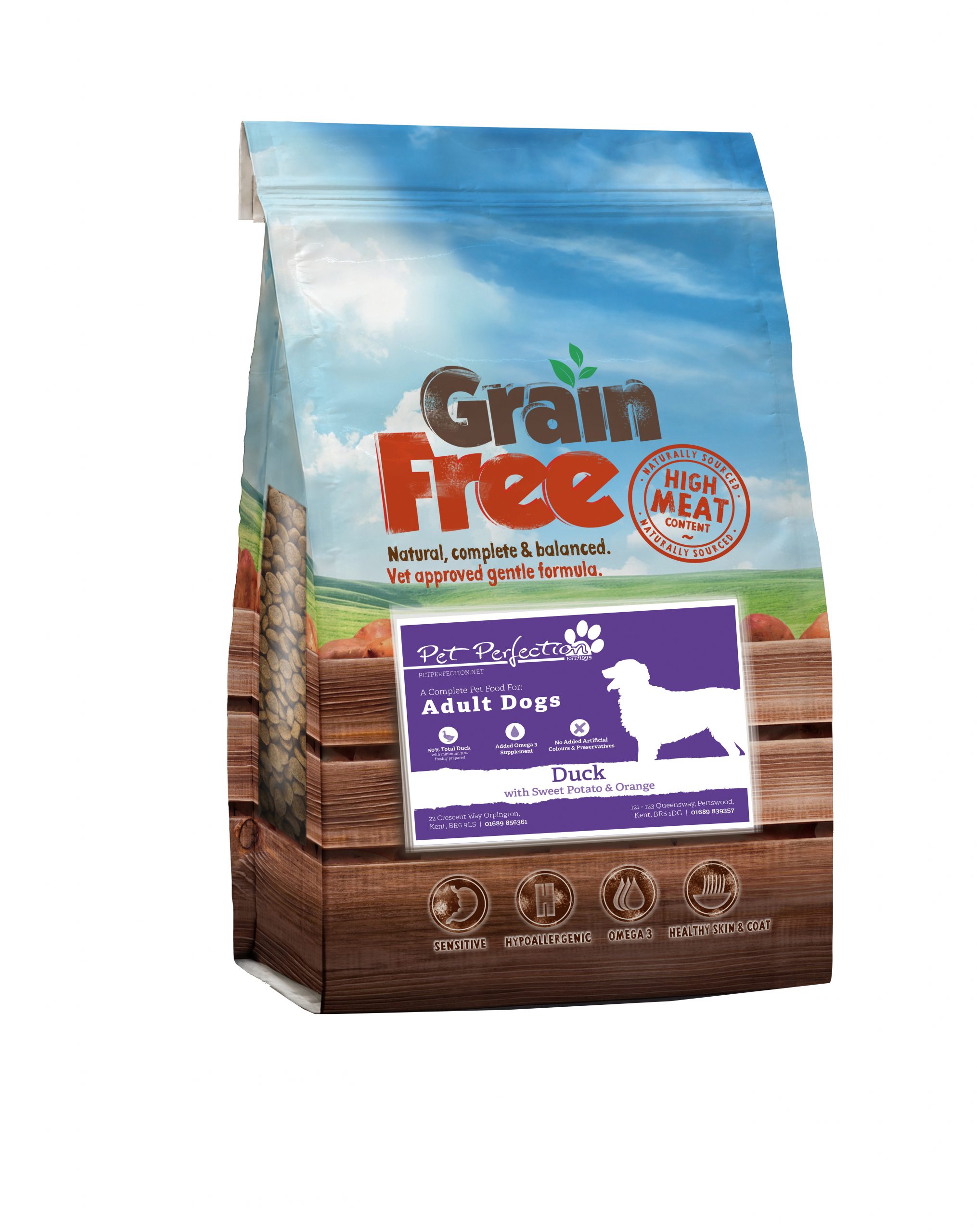 Duck 50%(including 28% Freshly Prepared Duck, 20% Dried Duck & 2% Duck Stock), Sweet Potato (26%), Peas, Potato (8%), Beet Pulp, Linseed, Omega 3 Supplement, Vitamins & Minerals, Vegetable Stock, Orange (equivalent to 7.5g per Kg of product), FOS (92mg/kg, MOS (23mg/kg)