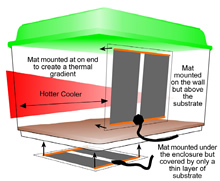 ProRep Heat Mats and Heat Strips are designed for use with reptiles, amphibians and invertebrates. They work by producing ultra long wavelength infra red heat that is absorbed by the animal and cage furnishings in much the same way as the sun warms basking animals or the ground in the wild. This action allows the animals to warm themselves without necessarily raising the air temperature in the vivarium or tank. The choice of heat mat size and installation method will depend very much on the requirements of the species and the design and size of the set up and supplementary heating may be required for species that require a more intense heat or localised basking spots to raise their body temperature sufficiently. Care must be taken to comply with the safety and installation instructions and the use of a thermostat is essential. ProRep Heat Mats and Strips are available in two different heating element materials – cloth and printed film – and in a range of sizes to suit most heating requirements and are manufactured in the UK to the highest safety standards.