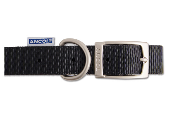 Traditional flat nylon collar with Ancol branded satin fittings as standard and heat sealed adjustment holes.