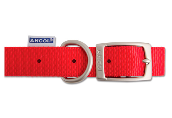 Traditional flat nylon collar with Ancol branded satin fittings as standard and heat sealed adjustment holes.